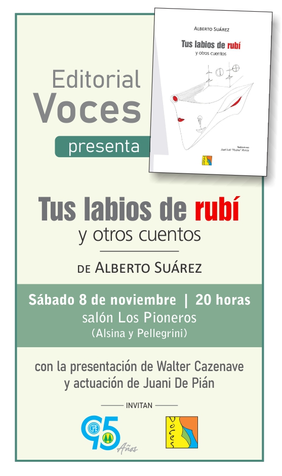 El próximo sábado 8 de noviembre, a las 20 horas en el salón Los Pioneros (en Alsina y Pellegrini), Editorial Voces de la CPE presentará el libro “Tus labios de rubí y otros cuentos”, del escritor y músico, Alberto Suárez, una obra que incluye relatos breves, con ilustraciones de José Luis “Pucho” Ponce. Definido por el propio autor como “un libro de humor, pero el humor como una herramienta para abordar temas serios de manera accesible”, “Tus labios de rubí...” reúne sesenta cuentos de Alberto Suárez, conocido además por su labor como guitarrista, cantante y compositor con una larga trayectoria artística. Su estilo de canción narrativa, por lo inusual y depurado, le ha valido el elogio de colegas de la talla de Jorge Fandermole.
