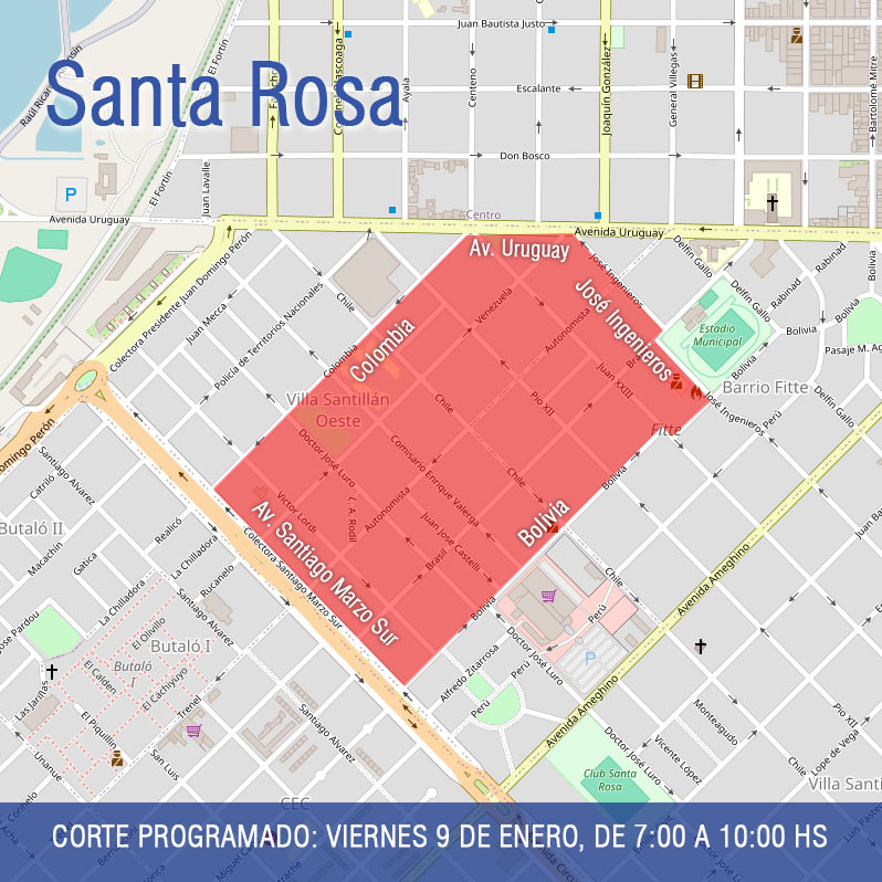 Este viernes 9 de enero, desde las 7:00 hasta las 10:00 horas, se interrumpirá el servicio eléctrico en la zona comprendida por las calles Colombia, avenida Uruguay, José Ingenieros, Bolivia y Circunvalación Santiago Marzo Sur, de los barrios Villa Santillán Oeste y Fitte.