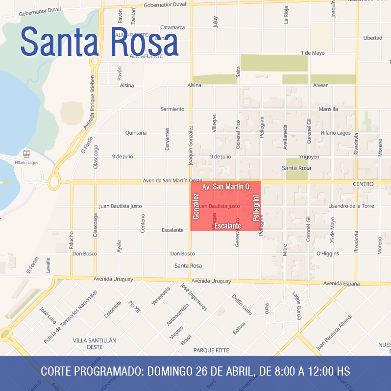 Este domingo 26 de abril, desde las 8:00 hasta las 12:00 horas, se interrumpirá el suministro de energía eléctrica en la zona comprendida por la avenida San Martín Oeste, Pellegrini, Escalante y González, del Centro de Santa Rosa. Personal de la CPE realizará tareas de mantenimiento en la subestación transformadora subterránea ubicada en Juan B. Justo y Villegas. Los trabajos se suspenderán en caso de lluvia o condiciones climáticas adversas. ...