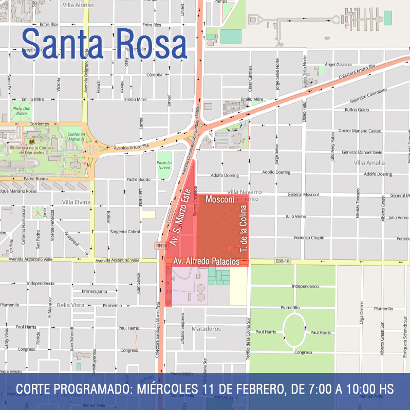 Este domingo 8 de febrero, desde las 7:00 hasta las 11:00 horas,se producirá un corte del suministro eléctrico en la zona comprendida por las calles Stieben, Catamarca, Antártida Argentina, 1º de Mayo, Centeno y El Fortín, del barrio Almafuerte de Santa Rosa. La interrupción del servicio afectará también a parte del complejo de la Laguna Don Tomás, en las zonas del camping, la pileta y los juegos. Personal de la CPE realizará modificaciones sobre las redes de media tensión que alimentan dicha zona, por las obras que se llevan a cabo en la calle Stieben entre Quintana y 1º de Mayo. Los trabajos se suspenderán en caso de condiciones climáticas adversas. ...