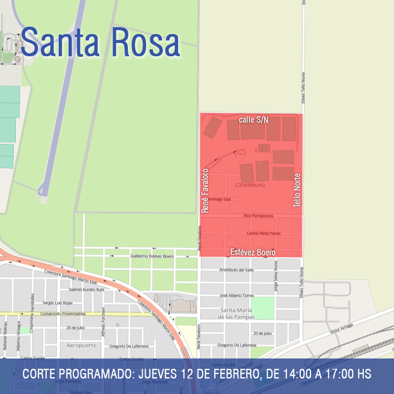 Este miércoles 11 de febrero, desde las 7:00 hasta las 10:00 horas, se producirá un corte del suministro eléctrico en la zona comprendida por la avenida Santiago Marzo Este, Blanco Encalada, Mosconi, Teófilo de la Colina y Avenida Palacios (veredas norte y sur) del barrio Villa Navarro Sarmiento de Santa Rosa. La interrupción del suministro abarcará, además, dos cuadras de la avenida Santiago Marzo, en el tramo que va desde avenida Palacios hasta Plumerillo (vereda este). Durante el corte, personal de la CPE realizará tareas de mantenimiento en la estación transformadora que alimenta la zona. Los trabajos se suspenderán en caso de condiciones climáticas adversas. ...
