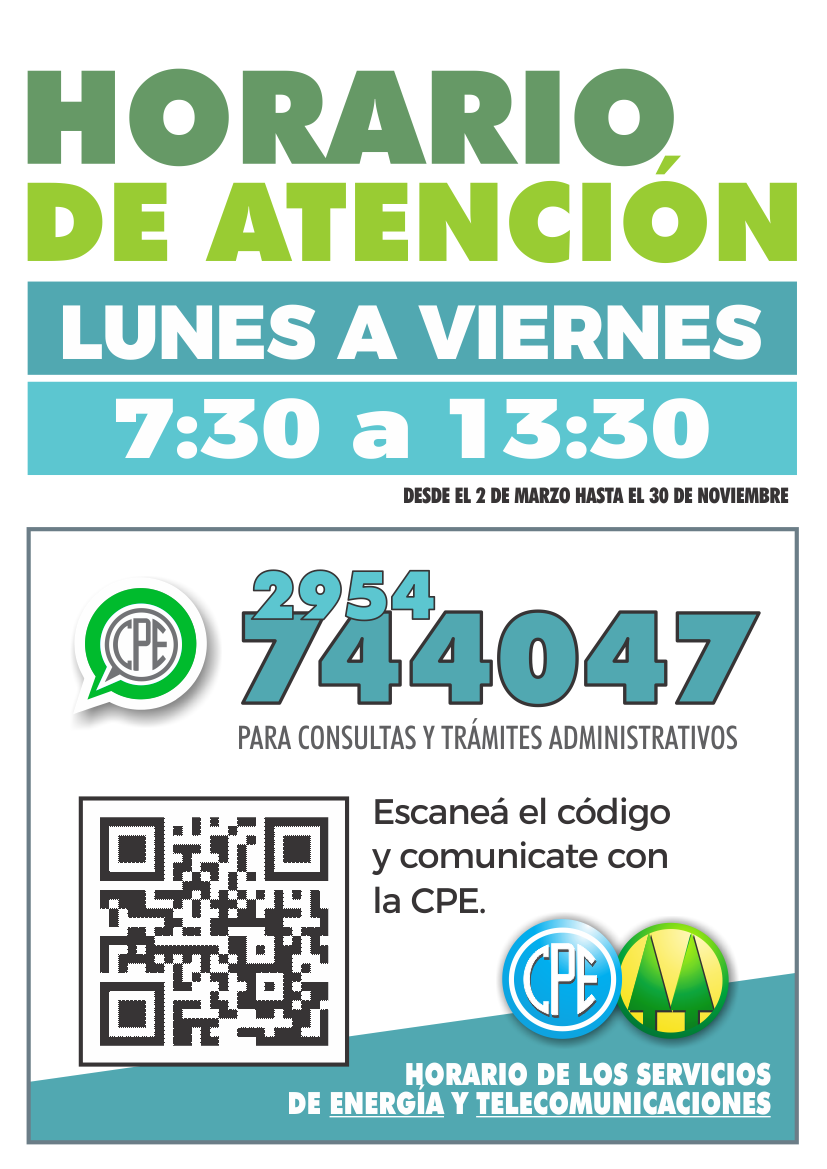 La CPE informa que, desde el lunes 2 de marzo, el horario de atención para trámites presenciales vinculados con las áreas de Energía y de Telecomunicaciones será, en todas sus sedes de Santa Rosa, de lunes a viernes, de 7:30 a 13:30 horas. Estos horarios estarán vigentes durante el período que va de marzo a noviembre, también en las localidades interconectadas, exceptuando Catriló, donde la atención para los trámites de Energía será entre las 7:00 y las 18:00 y para Telecomunicaciones, de 7:30 a 11:00 y de 14:00 18:00 hs, siempre de lunes a viernes. ...