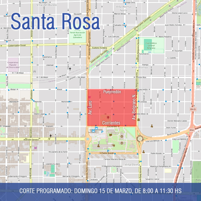 La CPE informa que el próximo domingo 15 de marzo, en el horario comprendido entre las 8:00 y las 11.30 horas, se producirá un corte programado del servicio de energía eléctrica en la zona delimitada por las calles Pueyrredón, Avenida Belgrano Norte, Corrientes y Avenida Luro, del barrio Villa Alonso de Santa Rosa. Durante la interrupción del suministro, personal de la CPE realizará tareas de mantenimiento que el en la subestación transformadora que alimenta la zona, ubicada en la esquina de Córdoba y San Jorge. Los trabajos se suspenderán en caso de condiciones climáticas adversas. ...