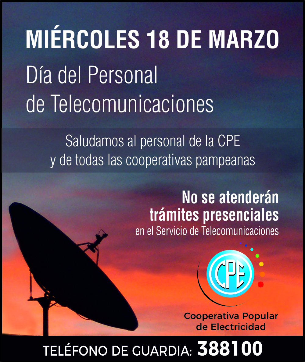 El miércoles 18 de marzo, con motivo de celebrarse el Día del Trabajador y Trabajadora de las Telecomunicaciones, no habrá atención al público de los servicios de internet, televisión por cable y telefonía de la CPE. Ese día se conmemora la la nacionalización de los servicios de Telecomunicaciones, resuelta en 1948, durante el gobierno del entonces presidente Juan Domingo Perón, con la creación de la Empresa Mixta Telefónica Argentina, antecesora de la Empresa Nacional de Telecomunicaciones (Entel). Por tal motivo no habrá atención de los servicios de Telecomunicaciones en ninguna de las sedes actuales de Santa Rosa (edificio de la Usina, sobre calle 1º de Mayo, y Centro "Carlos Lorenzo" en José L...