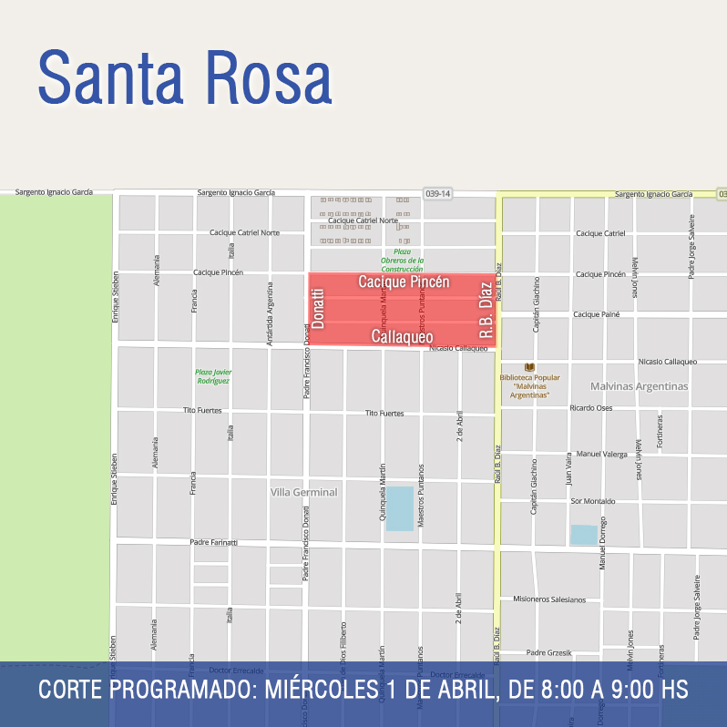 Este miércoles 1º de abril, desde las 8:00 hasta las 9:00 horas, se interrumpirá el suministro de energía eléctrica en la zona comprendida por las calles Raúl B. Díaz, Callaqueo, Donatti y Pincén, del barrio Obreros de la Construcción. Personal de la CPE realizará tareas de mantenimiento en una subestación transformadora ubicada en Payné Norte y Maestros Puntanos. En el centro También el miércoles 1º, desde las 8:00 hasta las 11:00, se interrumpirá el servicio en el área céntrica delimitada por avenida Uruguay, El Fortín, Don Bosco y Falucho. En ese sector, personal de la CPE remodelará la subestación ubicada en Uruguay y El Fortín. Ambos trabajos se suspend...