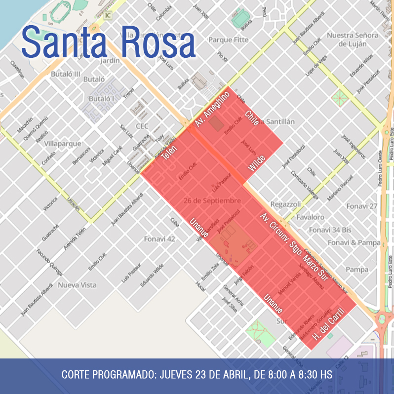 Este miércoles 22 de abril, desde las 8:00 hasta las 11:30 horas, se interrumpirá el suministro de energía eléctrica en las zonas comprendidas por la avenida Perón, Utracán, Telén y Armesto, del barrio Inti Hue, y la delimitada por Clavelinas, avenida Perón, Hernández y Juana Azurduy, de Villa Las Camelias. Personal de la CPE realizará tareas de mantenimiento en la red de media tensión que alimenta la zona. Las mismas se suspenderán en caso de lluvia o condiciones climáticas adversas. ...
