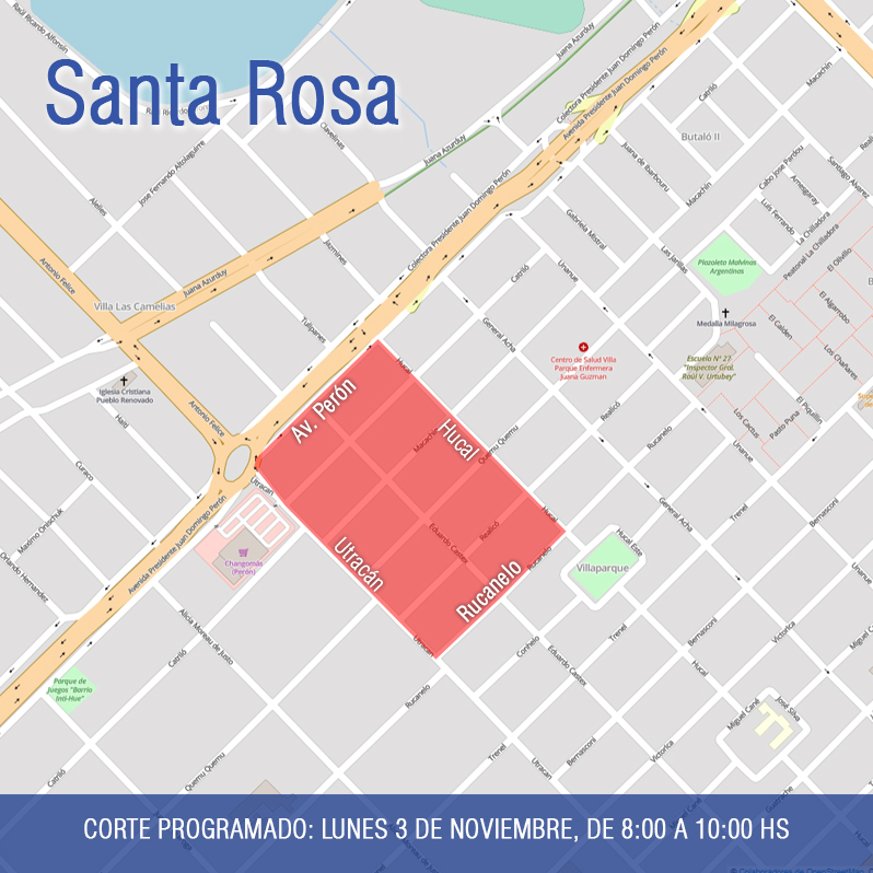Este lunes 3 se producirá un corte en el suministro eléctrico en la zona comprendida por la avenida Perón, Hucal, Rucanelo y Utracán, del barrio Villa Parque. El corte será entre las 8:00 y las 10:00 horas, para remodelar una subestación transformadora. Estos trabajos programados, se suspenderán en caso de condiciones climáticas adversas.