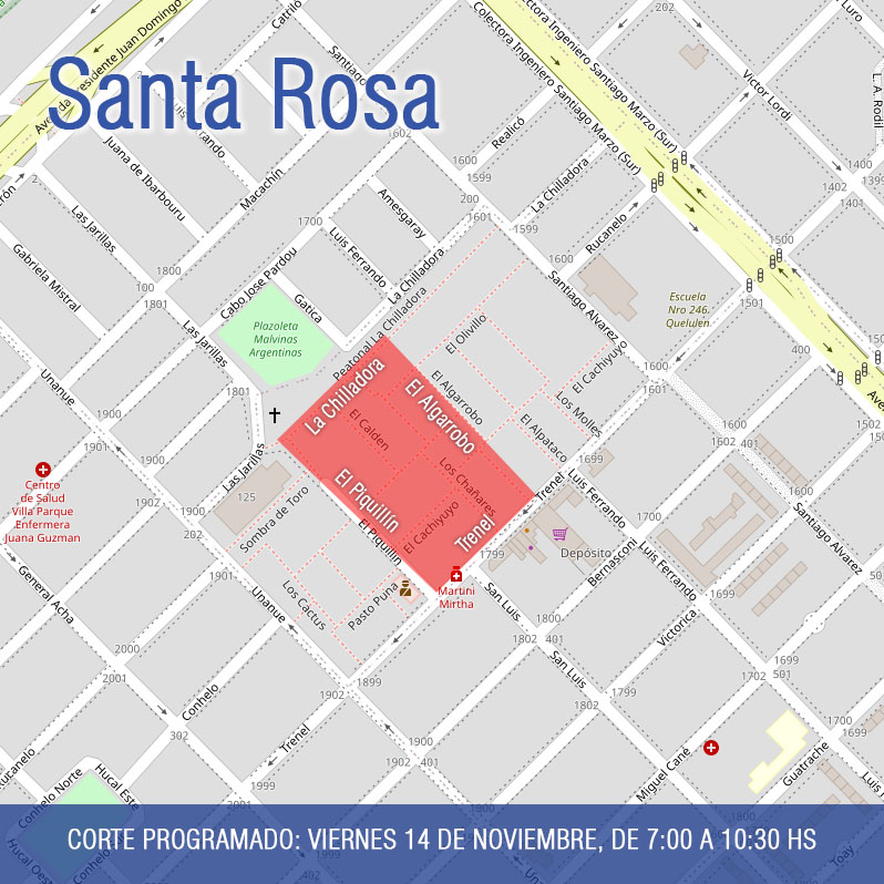 Este viernes 14 de noviembre, desde las 7:00 hasta las 10:30 horas, se producirá un corte en el suministro de energía eléctrica que afectará a la mayoría de los domicilios ubicados en la zona comprendida por las calles Trenel, El Piquillín, Peatonal La Chilladora y El Algarrobo, del barrio Butaló. Personal de la CPE realizará tareas de mantenimiento en una red de media tensión. Los trabajos se suspenderán en caso de condiciones climáticas adversas.