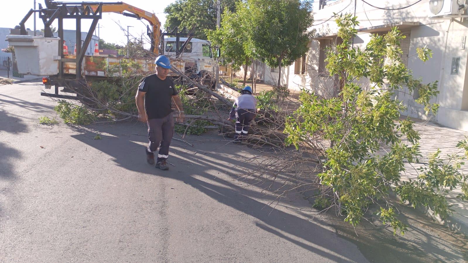 En Toay, sobre calle Sarmiento, entre España e Italia, personal de la CPE, Defensa Civil y de la misma municipalidad, estuvieron trabajando juntos para quitar un árbol caído sobre el tendido eléctrico.